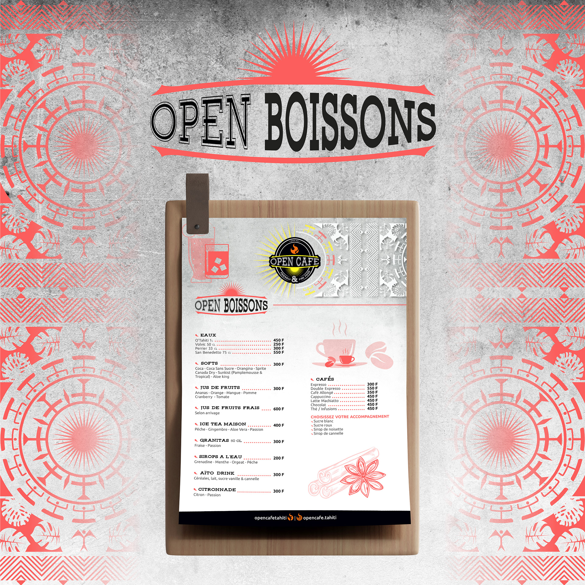 - FEUILLES TROPICALES : Évoquent la fraîcheur et la générosité de la nature, en écho aux ingrédients locaux et à l’idée d’une cuisine authentique et accueillante